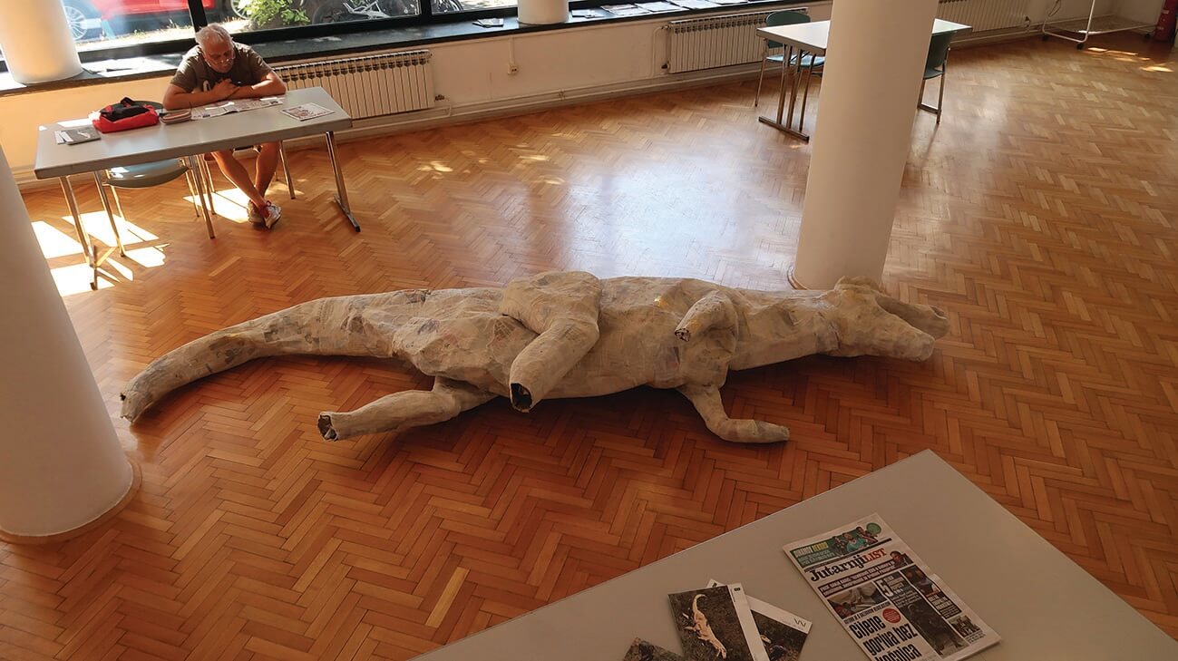 Što se tiče interaktivnosti, ona je, reklo bi se, stradala usput, kao kolateralna žrtva. Tek se formalno odnosi na suradnju s publikom koja, želeći do kraja pročitati najnoviju senzacionalnu vijest, mora okrenuti ambijentalnu instalaciju na drugi bok. Prava se interakcija odvija na relaciji izloška i prostora, naime, tijelo dinosaura, točnije odljev iz kalupa, zapravo je nosač, poput lutke u izlogu s odjećom, ako je dućan sportski tada je to trenirka, u zabavnom parku oblači izvorno odijelo, a u čitaonici novinsko. Drugim riječima, poput kameleona preuzima obličje prostora. Ovdje je došao takoreći gol, ulazi u interakciju i kameleonskom vještinom zrcali karakteristične elemente ne bi li se stopio s čitaonicom novina. Međutim, News by Dinosaur je oksimoron, nema starijih vijesti od dinosaurovih, one su otprilike toliko svježe koliko je i slon spretan među policama s porculanom. Ne da je u delayu od nekoliko sekundi, kao reporterka na Dnevniku, nego nekoliko milijuna godina, šarena je Zemlja u međuvremenu bar jednom bila u bijelom ogrtaču. Ne radi se o tome da današnjicu ne zanimaju vijesti, ona je njima preplavljena, nego je ne zanima ovaj zastarjeli model, strelovitom brzinom novosti bivaju zamijenjene novim novostima, nema više vremena za Jutarnji ili Večernji. Slikovito govoreći, dok su novine u tiskari, „Titanik“ je potonuo i već su napravili novoga i već su i njega potopili. Udar tehnologije na novine jednak je udaru asteroida na dinosaure, vijesti se prenose trenutačno, gotovo uživo, i smjesta su dostupne svima, koji ih neprestano, u svim prilikama, na brojnim platformama prate. Stoga je portret novinskog medija u prostoru namijenjenu njegovoj konzumaciji, što je već samo po sebi svojevrstan relikt, skoro pretpotopna situacija, posredstvom izumrle životinje više nego djelatan. Pogotovo kad se već ima spreman kalup.