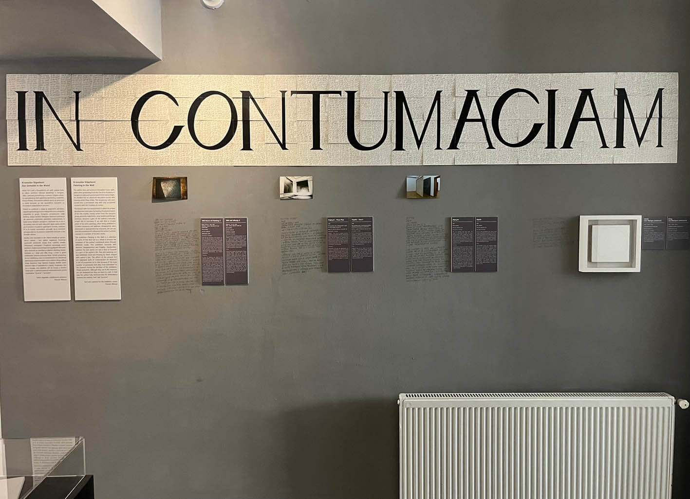 S druge strane, Muzeju se, kao uvertira u novi program, savršeno uklopio sadržaj njegove autorske izložbe koju bismo formativno mogli odrediti kao dokumentarističku ambijentalnu instalaciju. Izložbeni je prostor taman, na tamnosivim zidovima dominira velika svijetla ploha kao podloga crnim slovima: IN CONTUMACIAM (lat. neprekidno, stalno, iz ogluhe, u odsutnosti; kontumacijska se presuda izriče protiv tuženika koji nije pristupio ročištu niti pismeno osporio tužbeni zahtjev). Ispod tog ‘naslova’ nižu se slike u zidu (Das Gemalde in der Wand), odnosno izvješća o okolnostima, slikovito govoreći, nestajanja slika u zidu.
